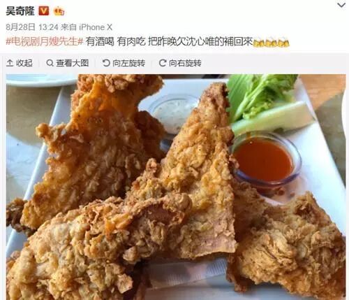 对比吴奇隆国庆节晒出的美食照片,都是鱼、虾、鸡翅等等,可以说大部分都是肉。还有七月份的时候,不止是肉,还有啤酒,左手一杯,右手一杯,非常的疯狂。