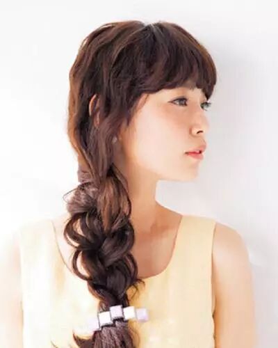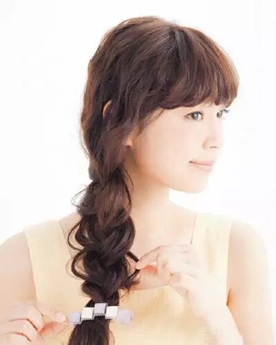 将头发编至发尾,略留一段,之后用清新可爱的发夹固定发尾;再将发辫轻轻用手拉扯出蓬松的感觉就好啦。