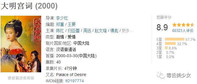 可有代表性的让大多数人一下能想起来的就是还珠和武媚娘,而前者她是配角成绩不能算她身上,后者呢不管是剧情画风还是对她演技的评价又都蛮差,其他她主演的电视剧在豆瓣评论人数超1000完了分在7以上的还没有,综合看,没被选上也正常吧。