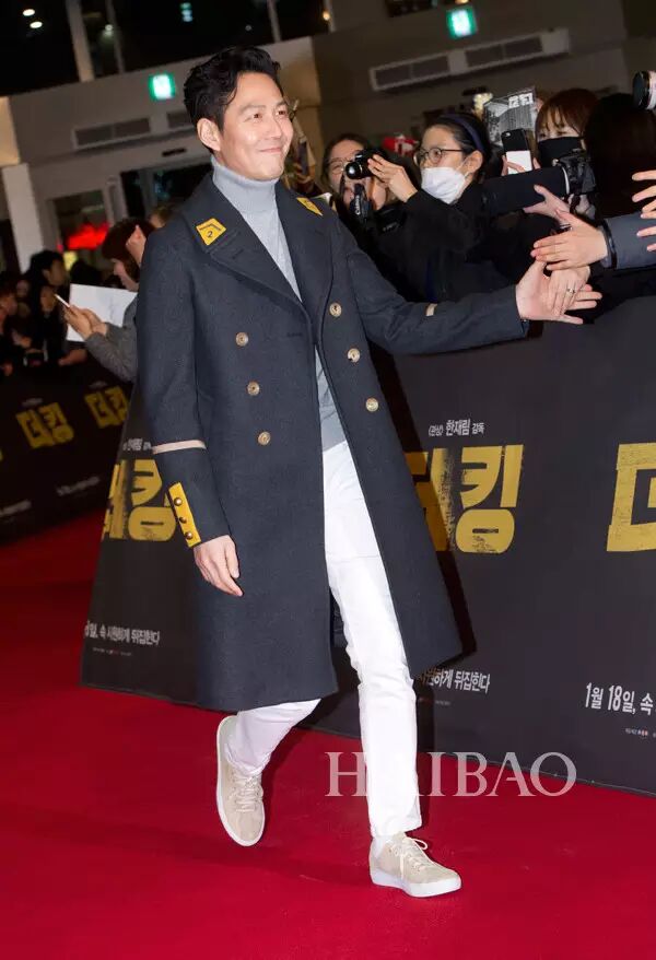 李政宰身着古驰 (Gucci) 2016早秋男士系列双排扣大衣现身电影《The King》的VIP试映式