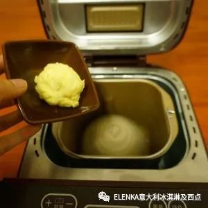 这次用的后油法~第二次揉面程序完成后加入黄油继续揉面。