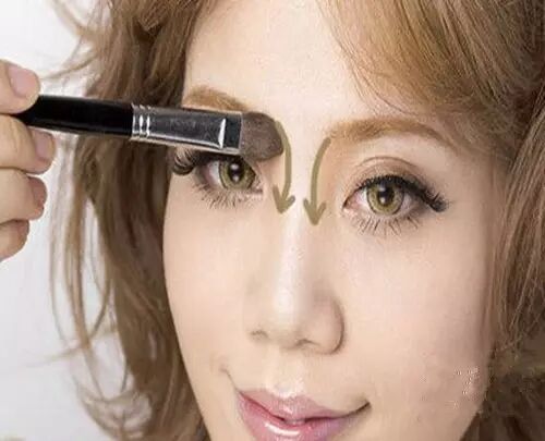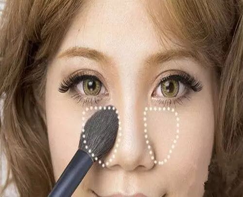 1、根据“亮色放大”的原理,用浅色高光粉在眉中心到鼻尖这一块长条区域打上高光,一定要打的笔直,才能显得鼻子挺。