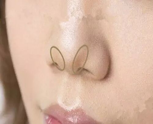 4、最后把带有淡淡珠光的蜜粉扫在鼻子两侧的皮肤上,让整体妆容更和谐。