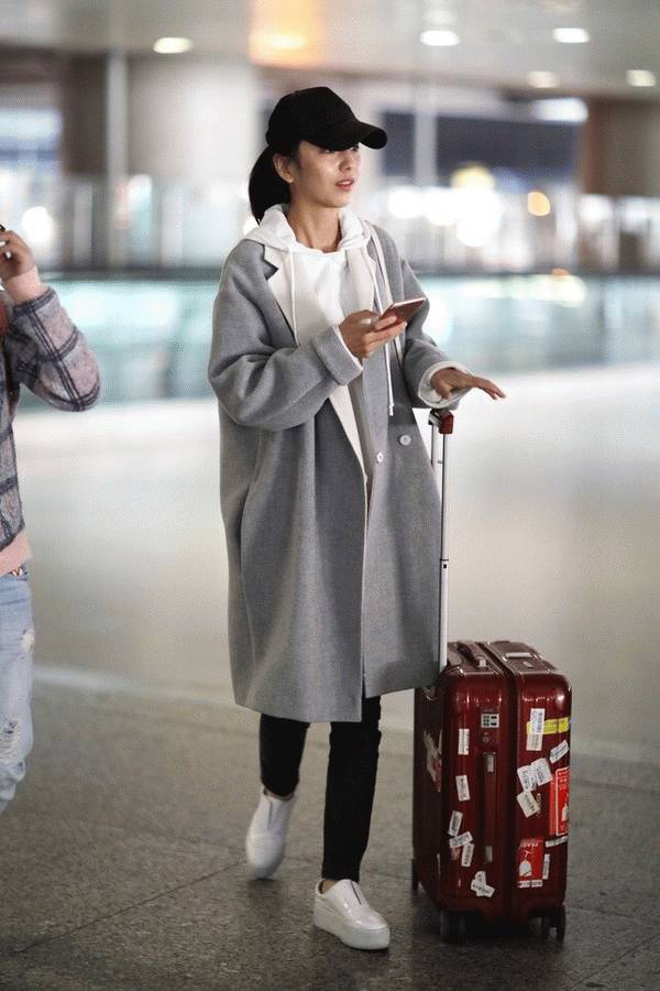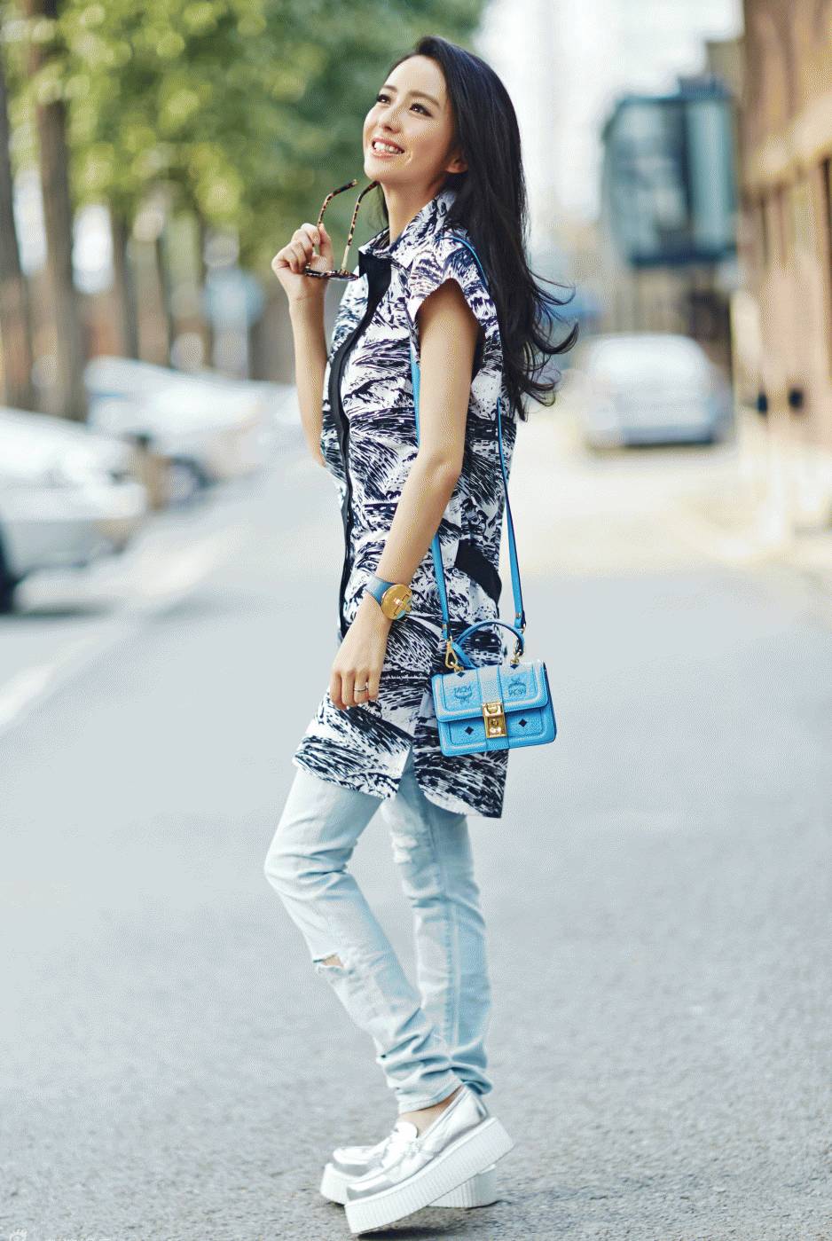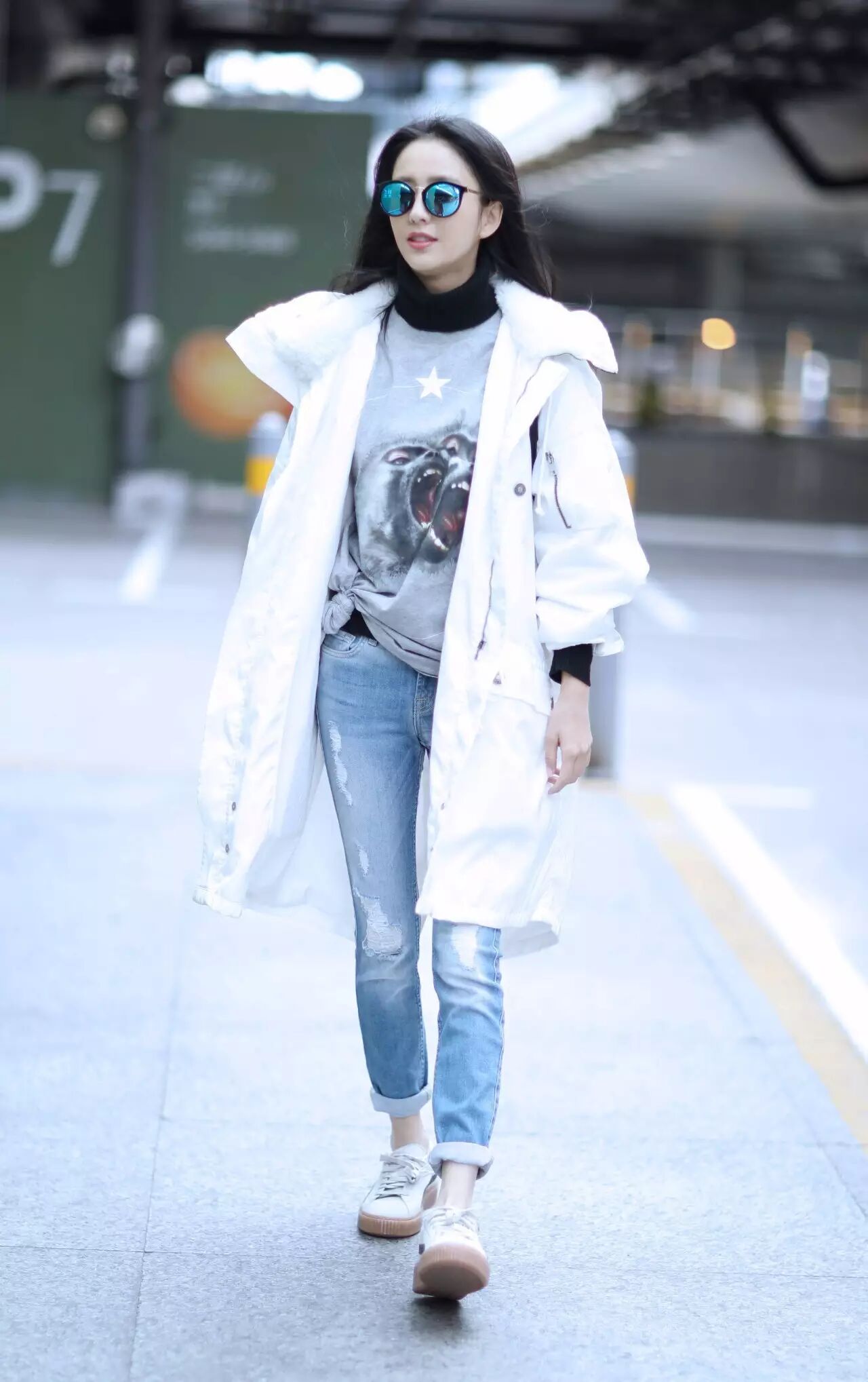 白色风衣搭配卷边牛仔裤厚底板鞋