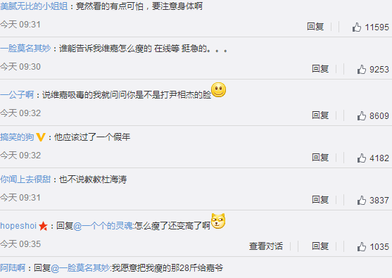网友也纷纷吐槽,“谁能告诉我维嘉怎么瘦的,在线等 ”“他应该过了一个假年”,甚至还有人怀疑维嘉吸毒了。