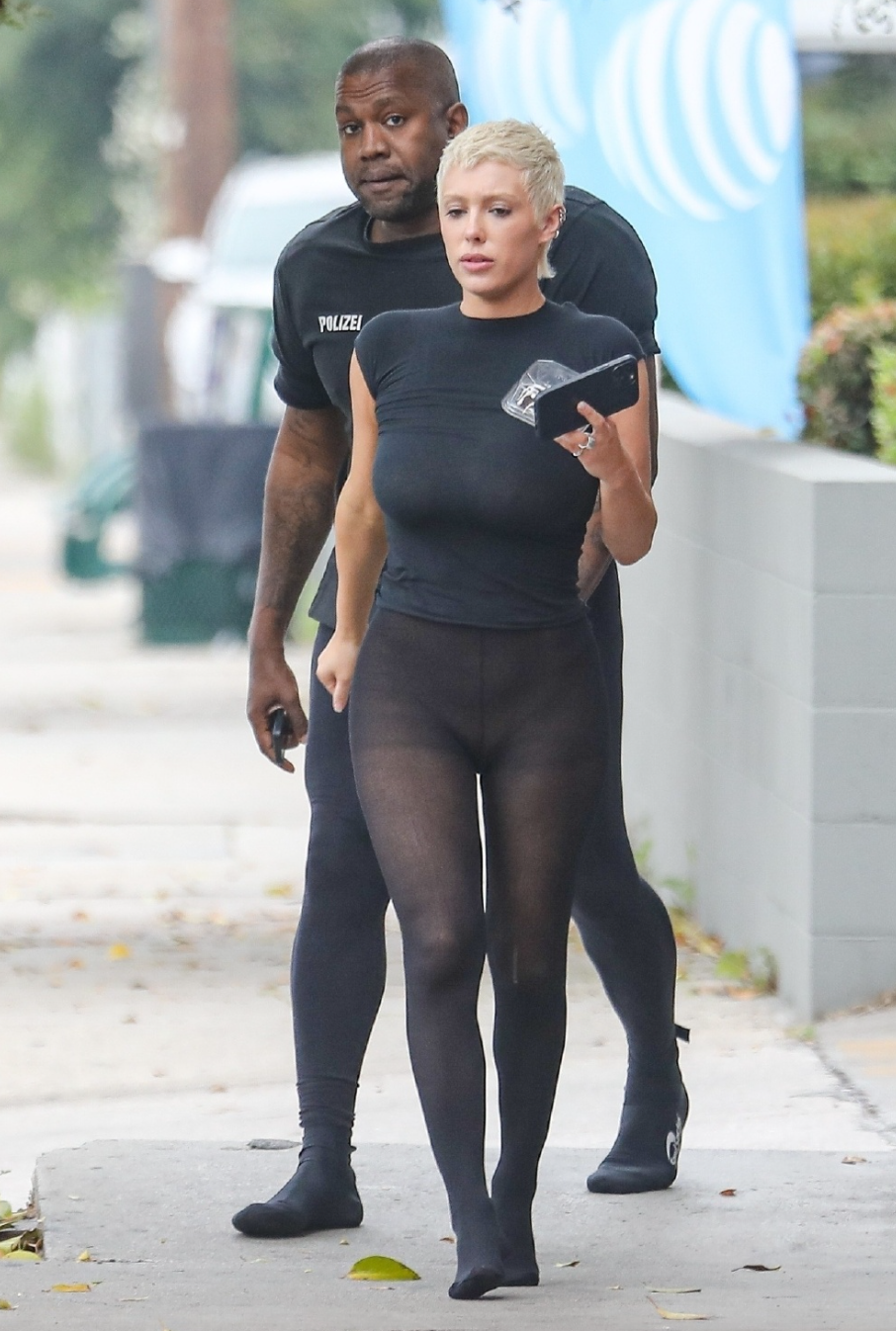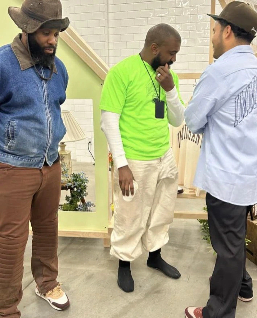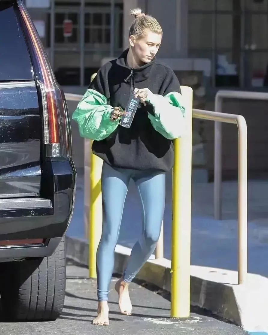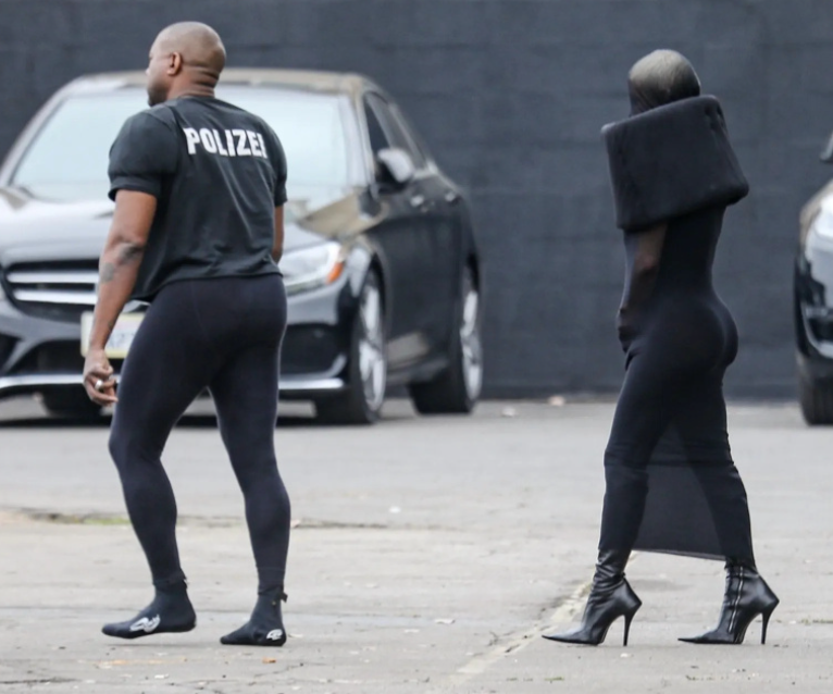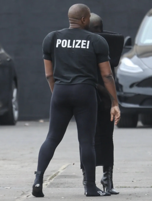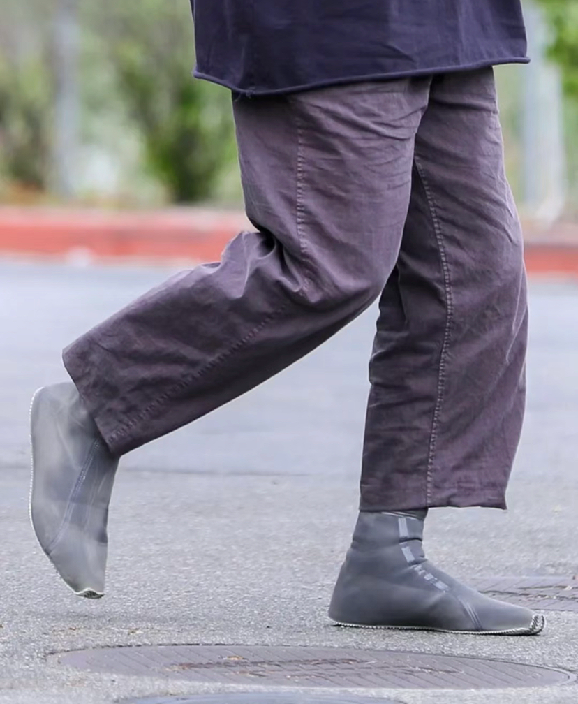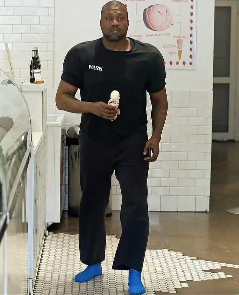 五月中,他继续减负,脚蹬轻薄蓝色面料上街,一旁的妻子Bianca Censori则穿着(疑似)灰色条纹中筒袜和他打配合。