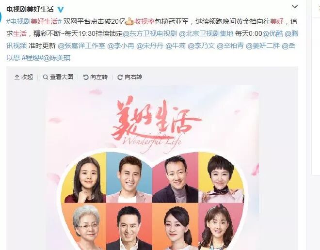 有关《美好生活》最新消息双网平台点击破20亿收视率,包揽了冠亚军,持续领跑晚间黄金档。看来观众们还是喜欢看有实力的演员的作品,恭喜《美好生活》!
