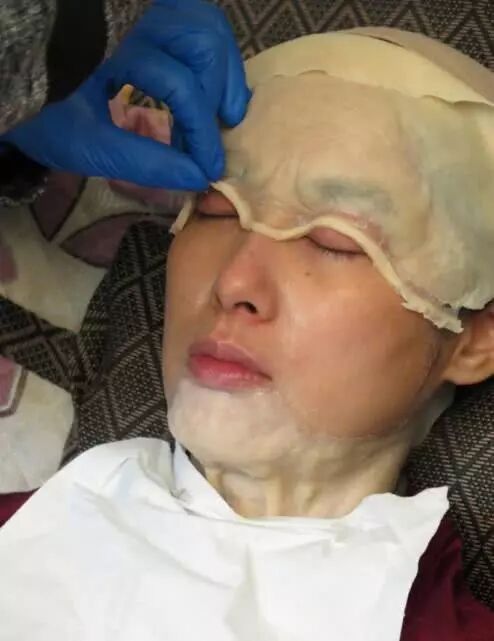 据悉,朱茵为了做这个头部倒膜,需要人皮道具一层一层粘在脸上,而且需要10个小时才能完成,化妆期间连觉都不能睡。