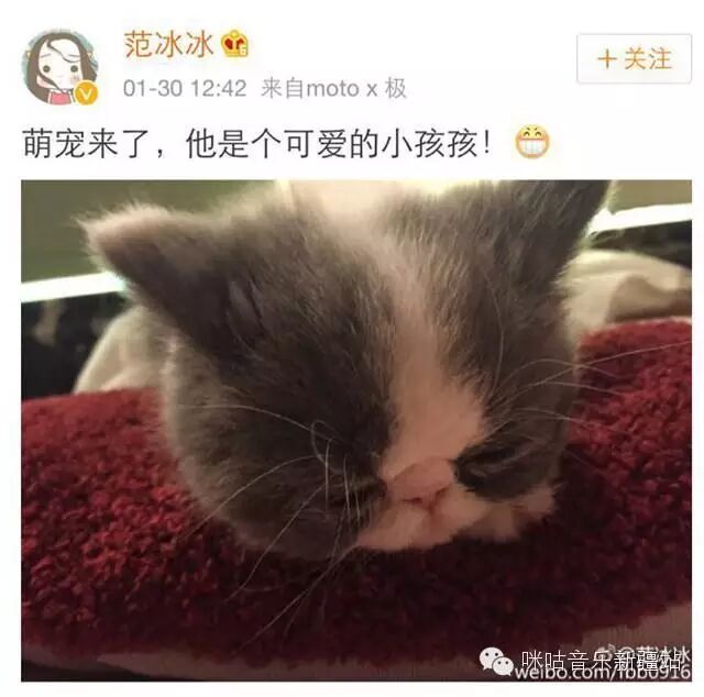范冰冰不是只爱“牛”她也爱猫!范冰冰最近也做起了铲屎官,在微博晒了一张萌喵的照片。不过是拿这只可爱的喵星人当做小孩孩练手的意思?