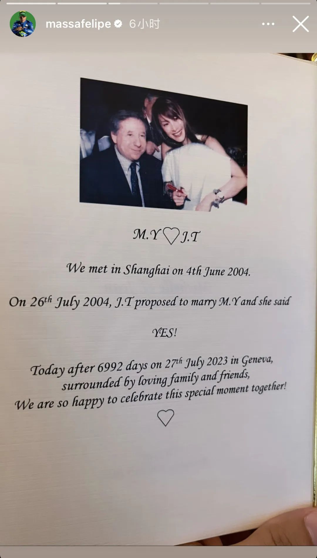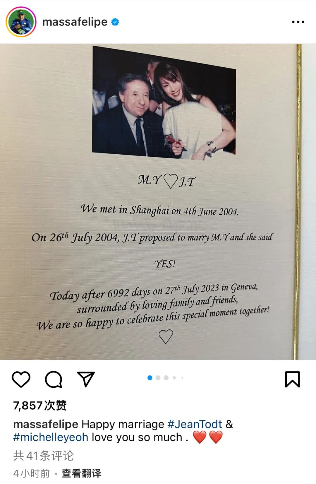 被求婚19年后,杨紫琼终于嫁了! 这里是美国 港台女星 2023-07-28 15:04:01 378 创作不易,用心坚持,欢迎请BaGua喝几杯爱心咖啡!打赏并支持本文 打赏并删除本文 家有喜事的不止有曾和马斯克两婚两离的女演员妲露拉·莱莉Talulah Riley哦,还有首位华裔奥斯卡影后杨紫琼!今天,巴西一级方程式车手菲利普·马萨Felipe Massa在社交媒体上分享了一张喜帖的照片,而这张喜帖上的男女主正是杨紫琼和与她爱情长跑19年之久的让·托德Jean Todt↓菲利普·马萨:结婚快乐#让·托德&#杨紫琼,很爱你们。请大家仔细看这张喜帖上文字,细节和爱意满满!“2004年6月4日,我们相遇于上海。2004年7月26日,让·托德向杨紫琼求婚,她回答了YES!在6992天后的今天,2023年7月27日在日内瓦,我们在亲朋好友的陪伴下,一起开心庆祝这一特别时刻。”被求婚19年后,杨紫琼终于嫁了!PS:认识一个多月就被求婚,答应求婚19年后才结婚,影后的人生真的是随心所欲呀~“结婚快乐”,菲利普·马萨还晒出了合影,这对新人的脸上都洋溢着幸福的笑容:新郎让·托德今年已经77岁了,但不难看到依然神采奕奕:不过,出镜率最高的似乎还得是这座小金人哈哈哈↓今年刚拿下影后,如今又步入婚姻殿堂,恭喜杨紫琼事业爱情双丰收!话说,杨紫琼成长与打拼的故事相信很多朋友都已经耳熟能详啦(感兴趣的朋友欢迎戳链接回顾:首位华裔奥斯卡影后,是杨紫琼)。所以我们今天就不多赘述了她的个人故事了,而是借着这桩喜事,聊聊她和他的故事。毕竟,能娶到影后的男人,自然也不简单。让·托德比杨紫琼大16岁,喜欢看赛车的朋友们一定对他不陌生,他在赛车界的地位不容小觑——他曾担任国际汽联主席,还是前F1法拉利车队领队,当年与F1车王迈克尔·舒马赫Michael Schumacher一起为法拉利赢得了多项冠军。而且据称,2004年让·托德在上海初识杨紫琼时就对她一见钟情,而为了追到杨紫琼,身为好友的舒马赫可是给了让·托德不少的恋爱建议。后来两个人顺利走到一起,这段势均力敌的爱情也一直很稳定——从前在F1大奖赛的法拉利VIP区,我们经常看到杨紫琼和让·托德出双入对,甜蜜互动,一起参加各种活动,2015年3月,米兰时装周杨紫琼过生日时,让·托德邀请众多好友为她庆生,牵手出场,相当恩爱。除了生活上的陪伴,两人也都见证了彼此事业上的重要时刻—— 2009年,让·托德当选国际汽联主席,当选当天,杨紫琼就在他身边。今年3月,第95届奥斯卡颁奖典礼的领奖台上,杨紫琼凭借《瞬息全宇宙》拿下奥斯卡影后,同时也创造历史成为奥斯卡历史上第一位华裔影后,陪伴在她身边的这个男人就是让·托德。虽然恋爱长跑19年,他们早已认定彼此为人生伴侣。但在相遇6992天后的这一天,他们还是选择步入人生新阶段。恭喜!往期回顾 创作不易,用心坚持,欢迎请BaGua喝几杯爱心咖啡!打赏并支持本文 打赏并删除本文 感谢您的支持鼓励,我会继续努力的!文章地址:用户邮箱:打赏金额:USDT 请输入数字点击”去打赏“,即可进行打赏支持本文章哦 杨紫琼 发表评论