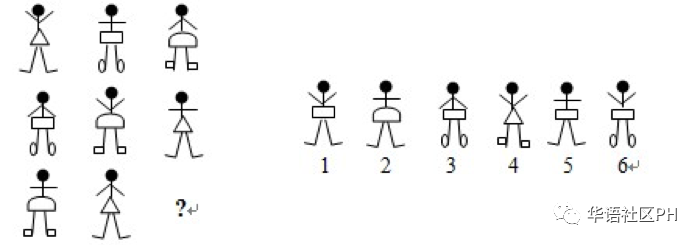 下图是由9个小人排列的方阵,但有一个小人没有到位,请你从右面的6个小人中,选一位小人放到问号的位置.你认为最合适的人选是几号?