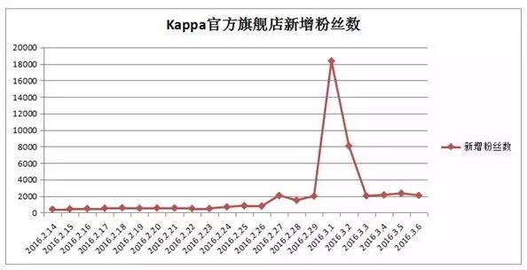 本次活动Kappa官方旗舰店微淘短期内粉丝暴涨3.3万人,单日最高增长超过1.8万粉丝,并且进入平稳后快速增长期。
