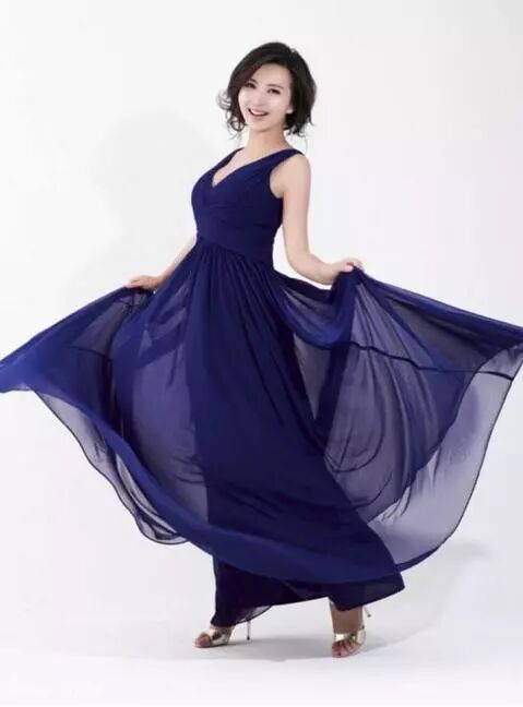 蓬松的低挽发造型彰显慵懒迷人的气质,陈好身穿一件蓝色礼服长裙轻盈飘逸女神范十足,小V领款式秀出优美的锁骨线充满吸引力。