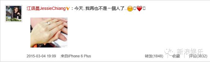 其实就是这姑娘结婚了,虽然是个老料....去年三月份人家就已经在微博上晒出大钻戒了。