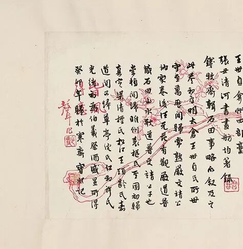 卷后除王世贞洋洋近千言诗跋外,复有张九一、程应魁、周天球、王顼龄、王芑孙、陈介祺等明清十三家长跋。明中期为王世贞什袭珍藏,后万历时归首辅常熟严讷家所有,崇祯间入袁枢之手。清初为一代大鉴赏家梁清标及王顼龄递藏,乾、嘉时转手入松江沈慈家,晚清时归杭州许乃普,继归宗室盛伯羲及爱新觉罗宝熙,则已至民国初矣。其间入手、过眼者尚多,不再一一指陈,流传经历已凿凿可考,其上鉴藏累累,然皆不损画面,诸家藏弆赏玩时谨谨珍护之心皆隐隐可见于卷头卷尾。故历五百余年人间沧桑,犹保存如新,诚为艺林之大观,世不一见之名品,识者其珍视之,其珍视之!!