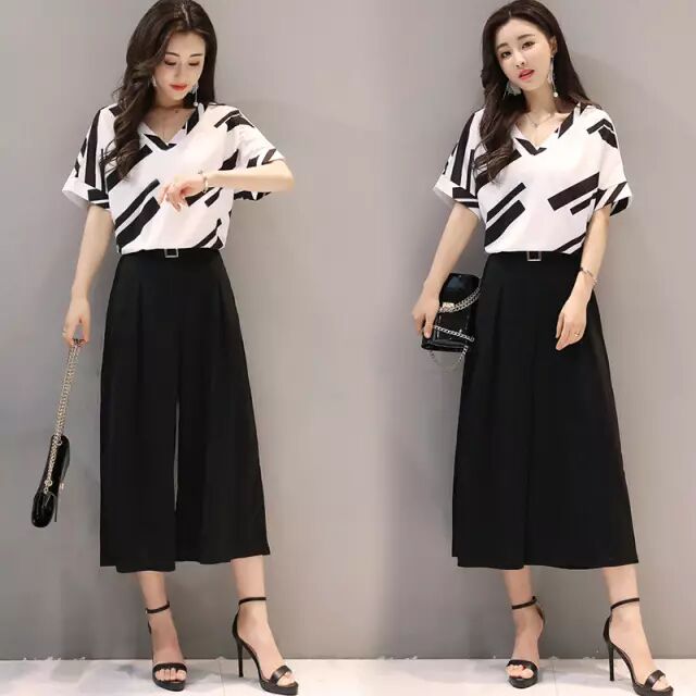 V领落肩款式版型上衣搭配纯色高腰阔腿裤经典不过时的套装时尚又实惠