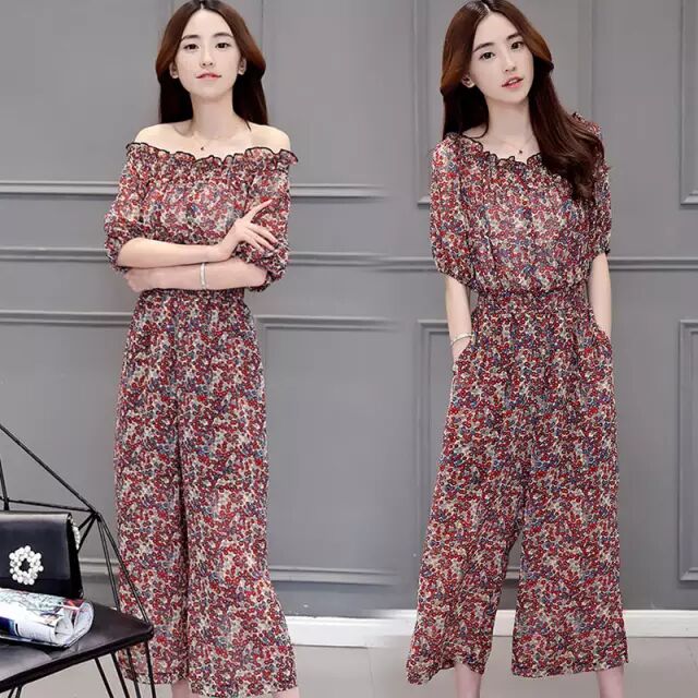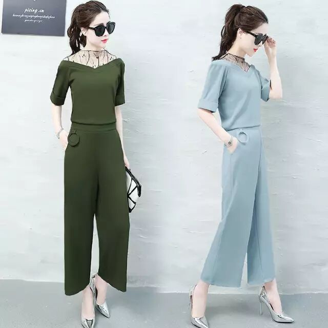 网纱拼接一字领口,展现精致锁骨,高腰款式阔腿裤完善身材比例