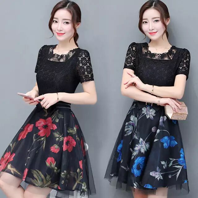 性感镂空蕾丝拼接印花连衣裙妩媚迷人,腰间蝴蝶结,增加衣服亮点