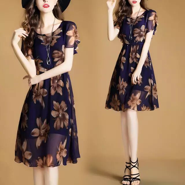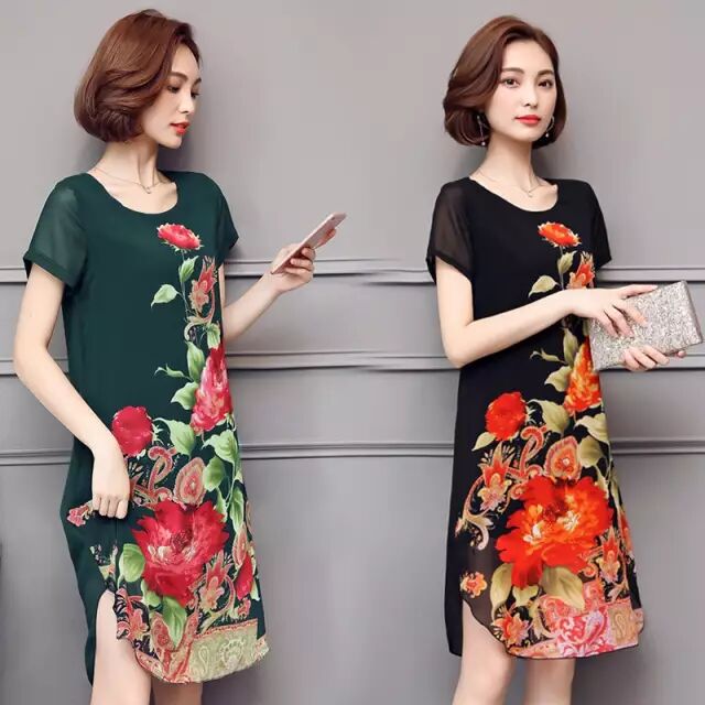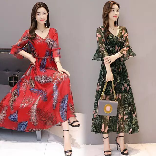 草木印花醒目吸睛,黑色雪纺长裙把气场衬托的更加高贵