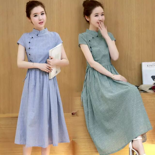 仿古装式排列排扣精致优雅,竖条纹衣裙清爽舒适