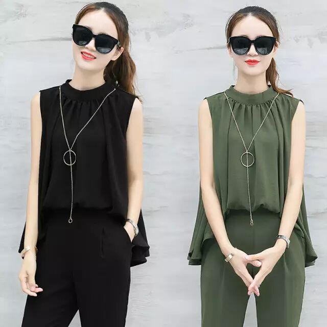 圆领无袖纯色套装干练有型,下摆拉链,可单件可连体