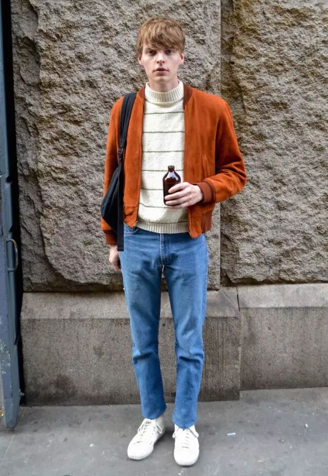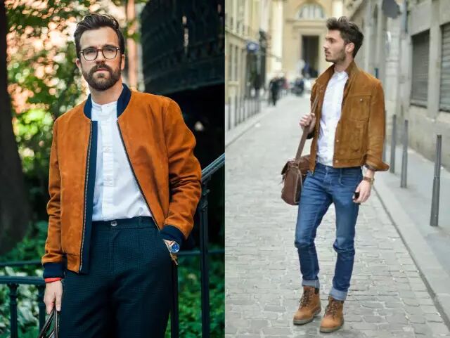选褐色是因为大部分男士经常穿的裤子都是深蓝色或者黑色的,褐色和深蓝色是对比色,黑色则是怎么搭都不会出错的颜色,而且黑色还有一个优点,就是容易被人忽视,搭配褐色夹克,让上半身成为视觉中心的话,会提升你的腰线,显得腿很长。推荐橄榄绿是因为它非常接近黑色,也是经典男士搭配颜色,那为什么不推荐黑色?因为黑色的麂皮夹克特别容易脏。