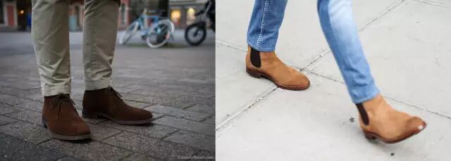 一般来说麂皮靴都是 Chukka 或切尔西靴这种简练修长的款式,麂皮的哑光质感不仅不会让靴子喧宾夺主,影响整体搭配,更有一种绅士的庄重感,麂皮就是这样,虽然不适用于晚宴这样的盛装场合,但是穿上麂皮,总会让人觉得你对待这次见面很认真,也容易给人留下优雅的印象。