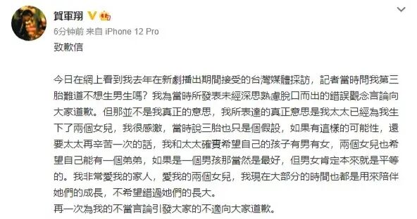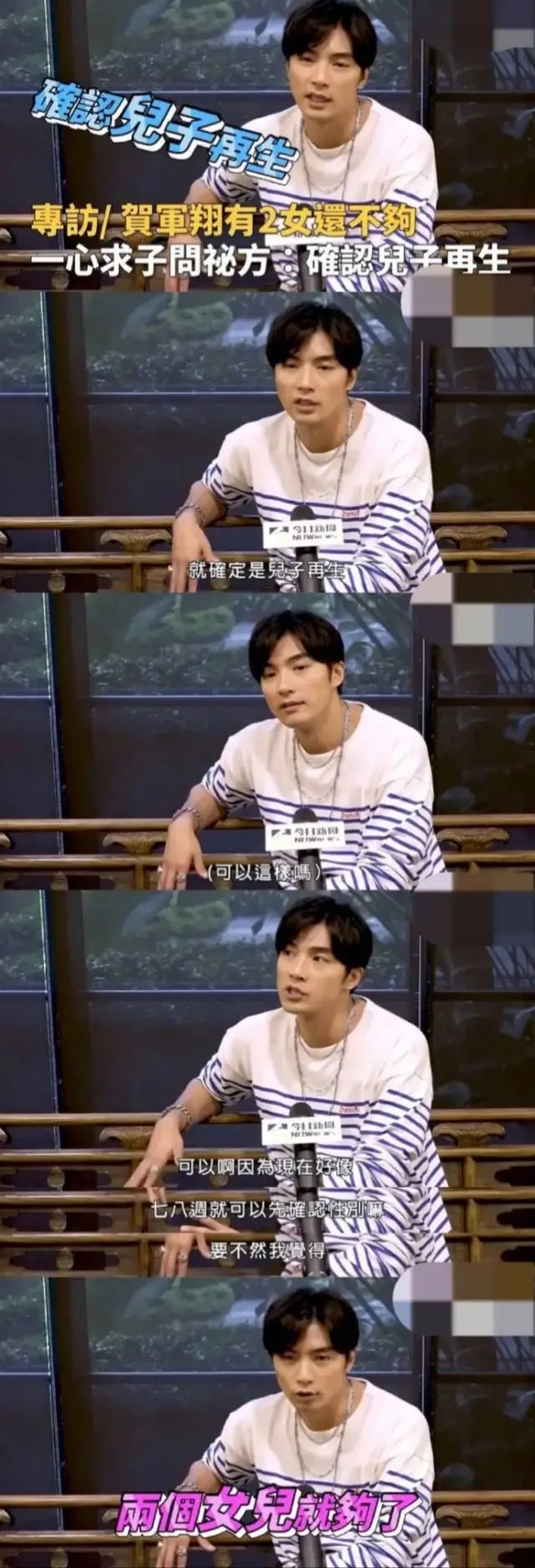贺军翔重男轻女,还是不尊重生命? 庭无尘 港台男星 2021-09-27 21:05:59 902 创作不易,用心坚持,欢迎请BaGua喝几杯爱心咖啡!打赏并支持本文 打赏并删除本文 贺军翔很久没有出现在公众视野,毕竟是老牌偶像了,偶像剧市场早已被年轻流量霸占多年,他的演技又一般,转型困难,加上结婚后专注于家庭,00后已经不认识他了。贺军翔最出名的作品是和杨丞琳主演的偶像剧《我的淘气王子》(又名《恶魔在身边》),我当年只看过几个片段,虽然对他无感,还是很认可他的颜值,真是帅得一批。仔细想想,台湾80后男星当中,他还真是颜值中的TOP。然而贺军翔最出名的绯闻居然是和郑元畅,有传言说郑元畅写日记表达过对他的爱慕和思念……去年他参加《吐槽大会》,还被当众调侃,“小美”的昵称也得到了很多不客气的笑声。他一下子黑脸,气氛有些尴尬。时隔一年,再次听到贺军翔的消息,是一段去年的采访突然曝光,然而他这一次被骂得很惨。贺军翔说,如果老婆怀三胎,要先确定是男孩才生,不然就不生了,“有两个女儿已经足够了”。还科普说胎儿七八周就可以查性别。这番话引来大举围攻,多数网友都说贺军翔重男轻女,滤镜碎了一地。贺军翔随后紧急道歉,并解释说本意是不希望老婆太辛苦,三胎也只是一个假设,而且确实希望有儿有女,并且两个女儿都想要一个弟弟。贺军翔同时强调“男女本来就是平等的”。从采访和道歉内容来看,贺军翔倒没有重男轻女的观念,坦白说,谁不希望儿女双全?有了儿子,想生女儿,没人觉得奇怪;有了女儿,想生儿子,怎么就不行了?子女为好嘛。然而,贺军翔还是没有正面回应;如果老婆真的怀三胎了,怀的依然是女儿,他还会生下来吗?如果不会,就只有一个选择:打掉!这和重男轻女相比,问题更严重啊,这不仅是不爱孩子,更是不尊重生命。——难不成除了郑爽,还有人支持打胎?亲手给了一个人生命,又亲手剥夺他的生命,多么残忍。真心希望贺军翔没有这个意思。PS:真心希望这两篇文被更多人看到,感谢!迪迦奥特曼被下架,以后的孩子还会相信光吗?豆瓣9.6高分的《无穷之路》,我不允许你还没看过! 创作不易,用心坚持,欢迎请BaGua喝几杯爱心咖啡!打赏并支持本文 打赏并删除本文 感谢您的支持鼓励,我会继续努力的!文章地址:用户邮箱:打赏金额:USDT 请输入数字点击”去打赏“,即可进行打赏支持本文章哦 贺军翔 About the Author 庭无尘 功能介绍:户庭无尘杂,虚室有余闲。 Related Posts 吴镇宇拒绝拍短片,德格娜褒贬不一,宁元元捡到宝,现场火花四溅 2021-11-14 20:35:45 贺军翔重男轻女,还是不尊重生命? 2021-09-27 21:05:59 发表评论