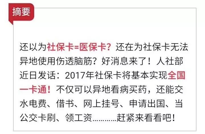 而社保卡实现全国一卡通之后,大家可以通过社会保障卡实现本地和跨地的医疗保险、工伤保险、生育保险医疗费即时结算,支持挂号、诊疗、妊娠登记、住院登记、购药等就医过程的信息服务,实现就医一卡通。