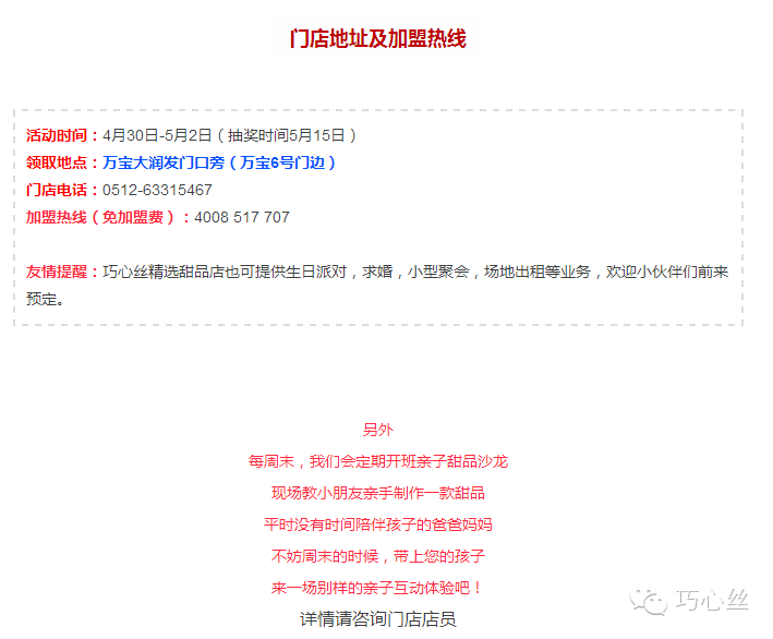 2、将文章发布至朋友圈截屏,名字、手机号码一起发至巧心丝公众号,或到门店登记姓名电话,即可参与抽奖;(抽奖时间为5月15日)