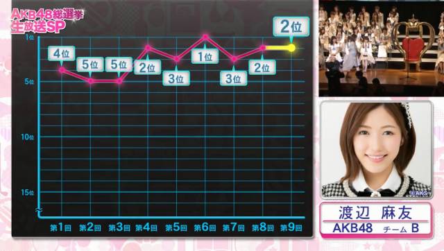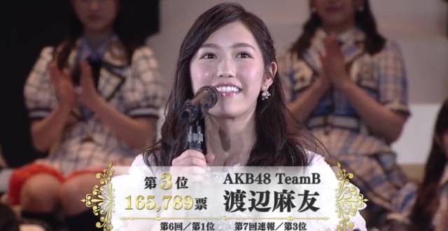 在这次选举中,渡边麻友以总选举史上最高票数15万9854票勇夺1位,超越了去年冠军指原莉乃。而在这一届中的渡边麻友,也是至此留在AKB48的当年的“神7”中的唯一一位成员。