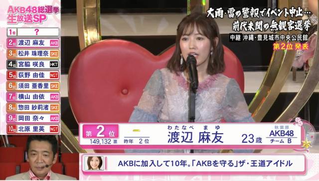 渡边麻友在充满泪水的感言中反复强调:下次一定要收获更高的名次!表达了自己的不甘。