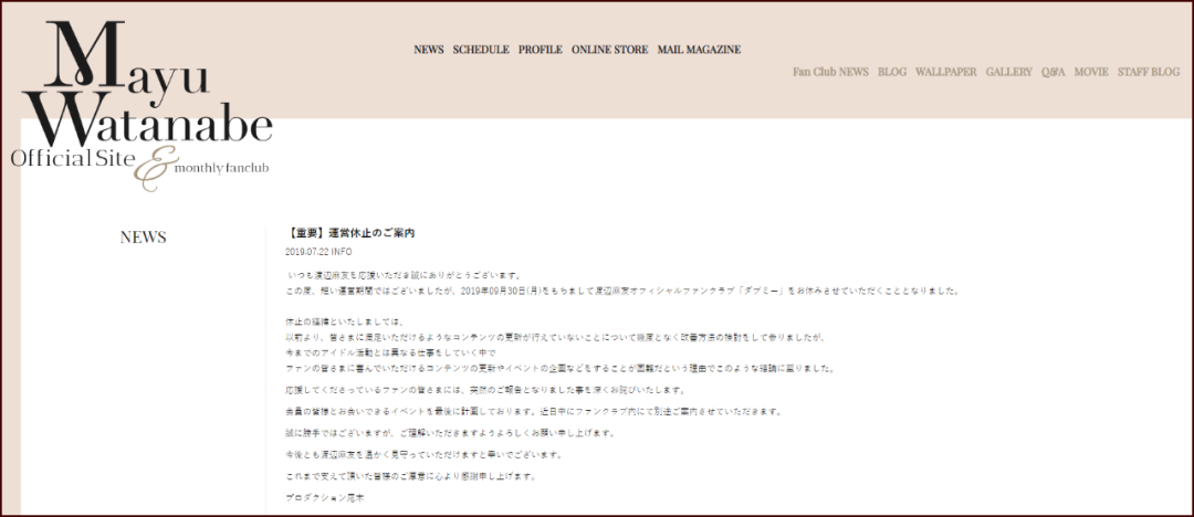 2019年7月22日,渡边麻友因为工作无法照顾到粉丝俱乐部的相关运营,正式决定关闭粉丝俱乐部。