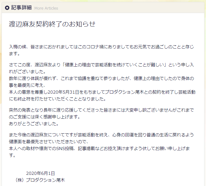 事务所表示这几年渡边麻友的身体状况一直不佳,在之前已经有过多次的协商。在综合考虑后还是以身体为第一优先,尊重其本人的意愿,双方结束合约,同时也正式结束演艺活动。