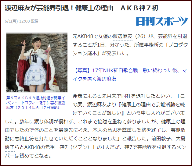 渡边麻友所在的事务所「プロダクション尾木」于今日发表了她退社的消息。据悉,渡边麻友在上个月末正式退社,理由是: