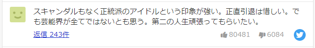 对于这突如其来的“退圈发表”,粉丝们感到震惊与伤感,但更多的是表达了支持。她也成为了AKB48中第一位退圈的“神7”成员。