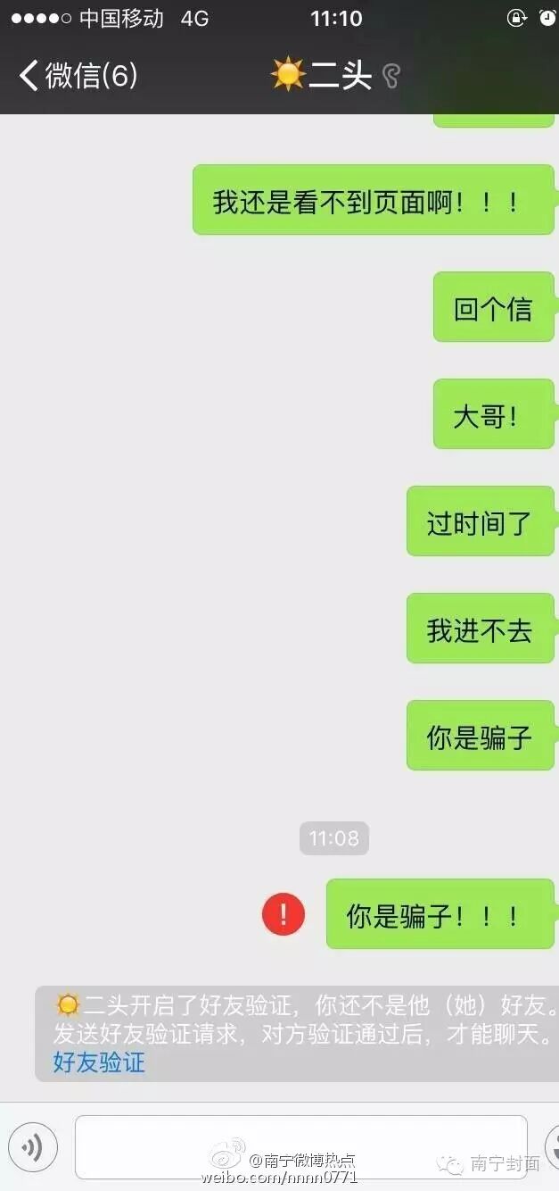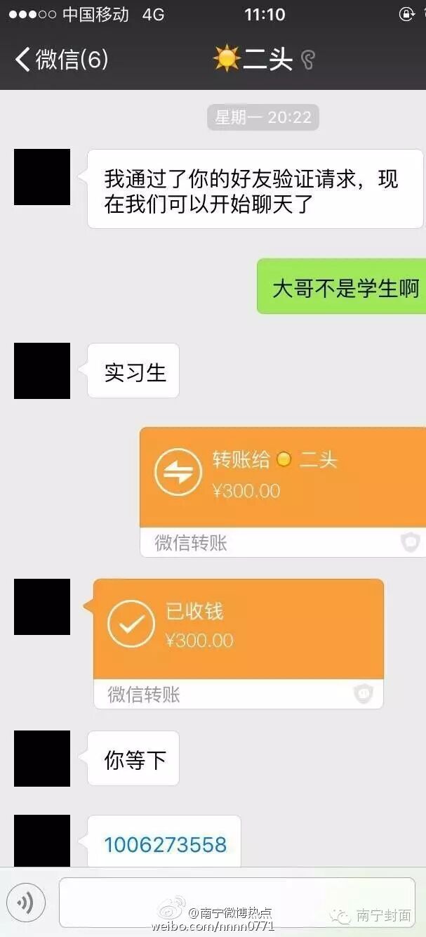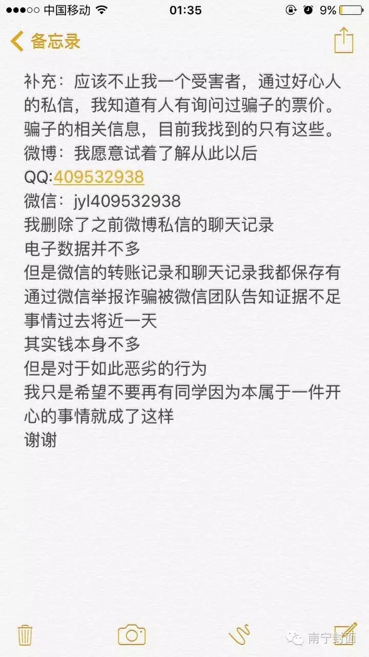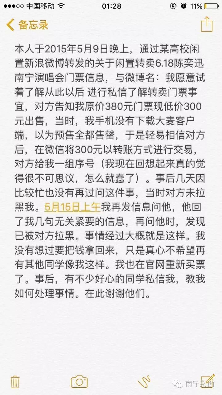 网友@弥顿道土司 爆料:他在微博上看到有人卖@陳奕迅所長 南宁演唱会门票,380元门票只需300元,于是付款了,对方只是给了一组网上卖票的序号,过几天之后对方把自己拉黑了,才知道被骗。来看一下被骗过程。
