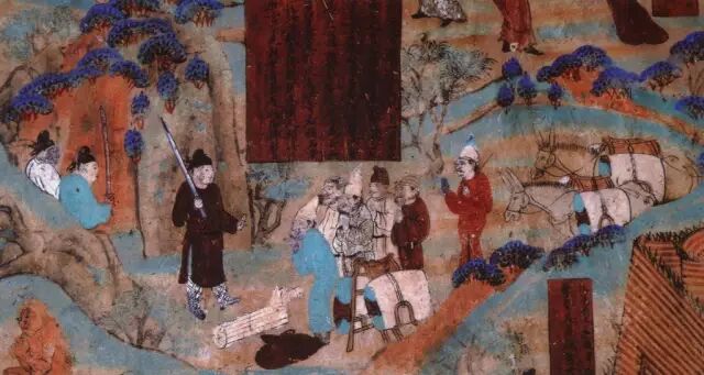 莫高窟壁画,盛唐时期,胡商遇盗图,反映当时丝绸之路上的各种艰难险阻。