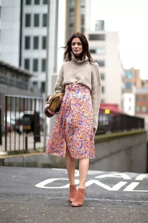 高领毛衣搭配高腰印花半裙,把毛衣塞进半裙里