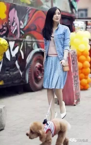 牛仔外套搭配蓝色碎花百褶裙,十分清新自然,粉裸色针织上衣带来淑女感,白色尖头高跟鞋更好地修饰熊乃瑾的美腿。不过小编最喜欢的还是那只小贵宾,毛茸茸的好口爱~