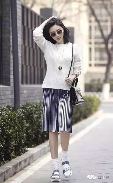 熊乃瑾身穿现今流行的蓝白条纹百褶裙,搭配一件纯白色针织毛衣,清新脱俗,长项链的搭配不显单调,不过凉鞋与白袜子的搭配虽然很时尚,但小编比较接受不了。