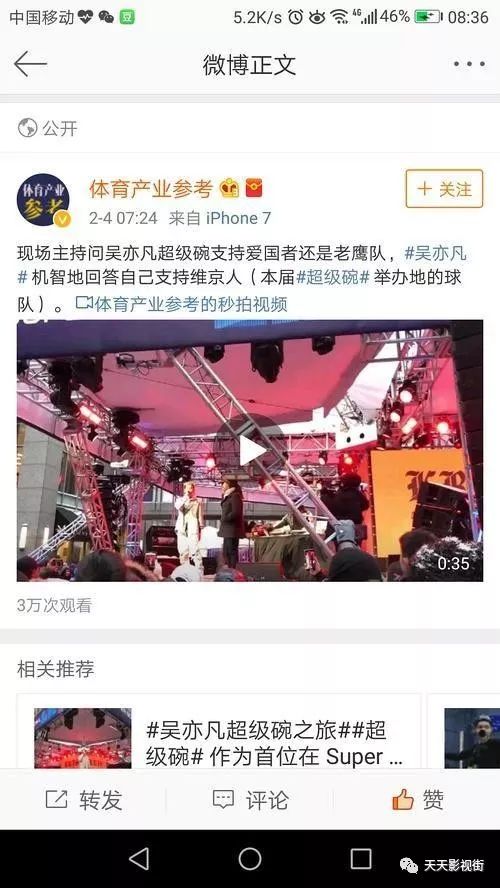 原来在表演结束之后,主持人给吴亦凡挖了一个坑,主持人吴亦凡这次是支持爱国者队还是老鹰队。对于不了解超级碗球队的同学,我要科普一下,主持人提出的这两支球队正是超级碗决赛要对垒的两支球队。但是为什么说这是陷阱呢?因为这两支球队都不是吴亦凡所在地明里苏达的球队,这就好比你在上海表演,主持人问你你是支持北京队还是广州队。不过吴亦凡显然是看出了这是陷阱,他机智的回答道自己支持维京人队,也就是当地的球队。这个回答让下面的球迷们非常开心,引起了现场的一阵欢呼,“WOW! We Love you, Kris Wu!"