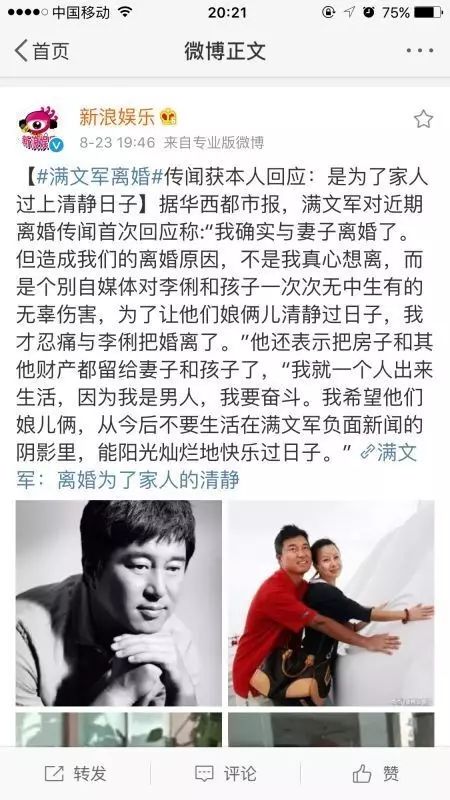 这两天满文军离婚的事情满天飞,而他对于离婚的解释看上去更是让人摸不着头脑:为了让家人过上清静日子,才忍痛离婚,并将所有财产和房子都给了妻儿。