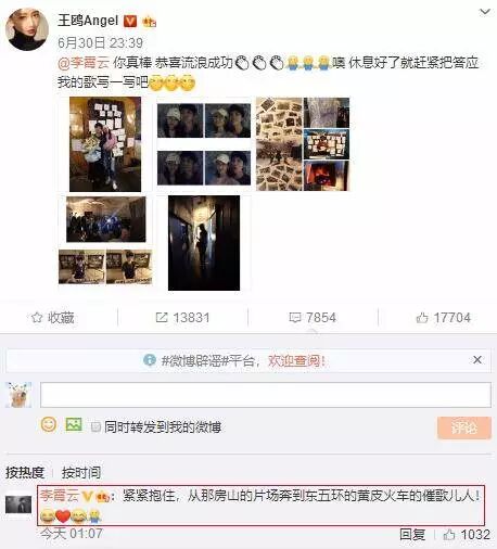 李霄云办展,王鸥特意赶来捧场:“李霄云你真棒恭喜流浪成功噢休息好了就赶紧把答应我的歌写一写吧。”而且李霄云也回复:“紧紧抱住,从那房山的片场奔到东五环的黄皮火车的催歌人儿!”语气熟络。