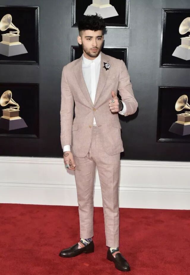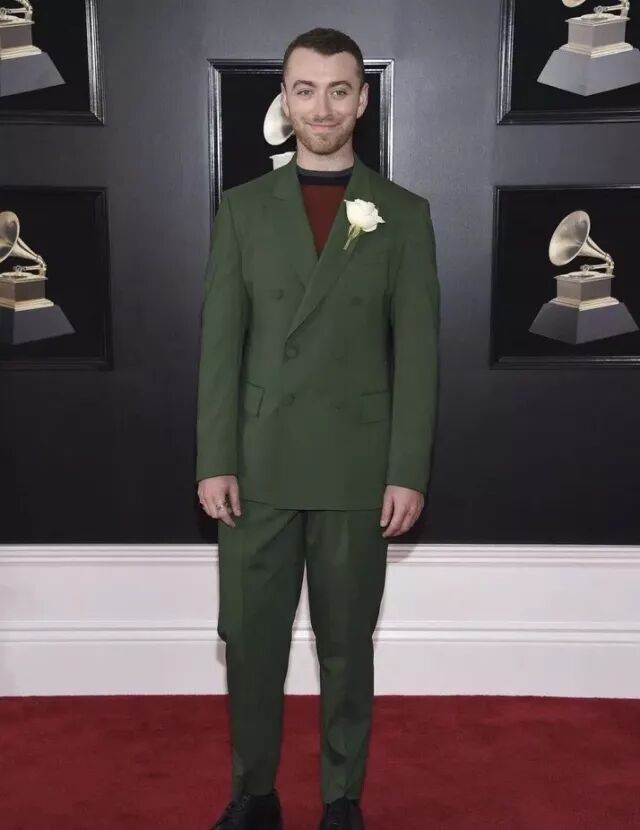 Sam Smith当晚身着一身绿色西装内搭暗红色针织衫,简直就是红配绿最时髦最标准的穿搭典范!色调柔和,满满的雅痞高级风,给一百个赞都不为过了!