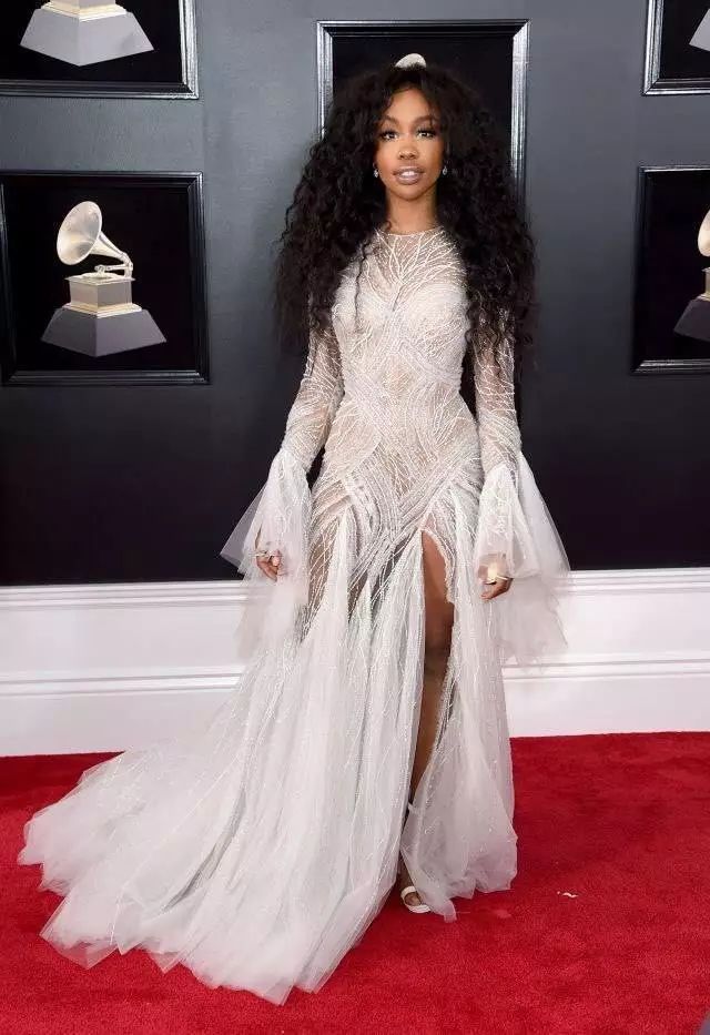 SZA身穿Versace2017系列礼服,爆炸头配上仙系的礼服总是有一丝不搭调,给人一种怪怪的感觉。如果SZA能将长发利落的挽起来,或许能够给这身仙女装加分不少。