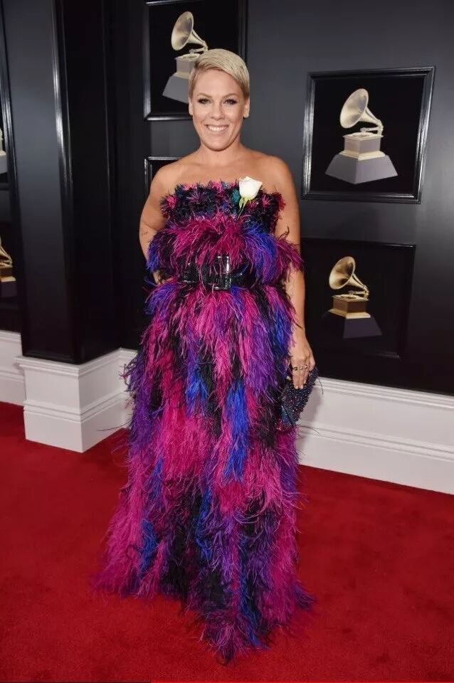 PINK粉妈以一袭夸张的烟火羽毛裙亮相,虽然这身衣服给人以惊艳,但是寡淡的妆容与抓马的衣着显得格格不入。事实证明,协调才更美。