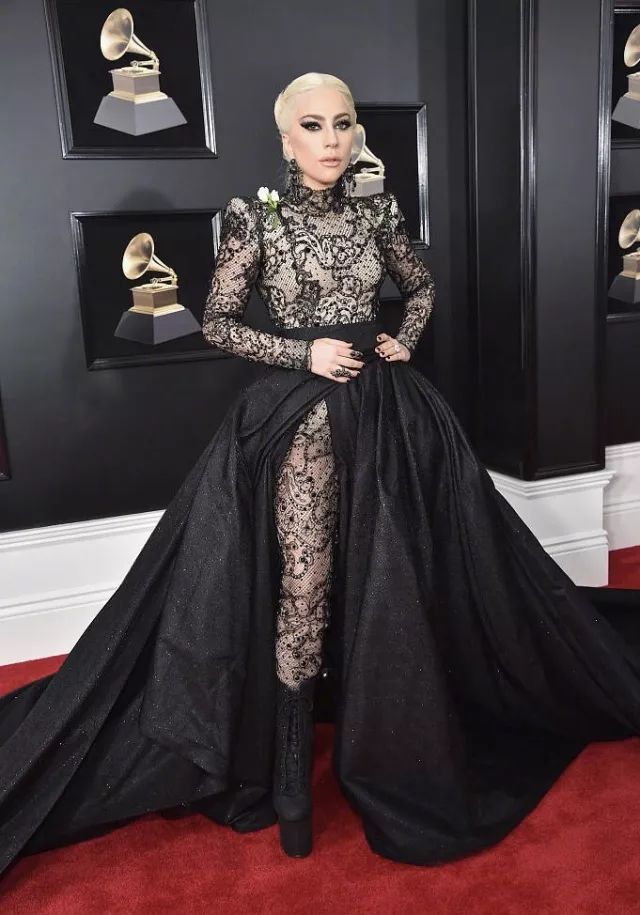 当晚,Lady gaga身着Amarni Prive高级定制蕾丝透视礼服出镜,配上用黑色皮绳编织的鱼骨辫,我们的鳖女士——Lady gaga作为如此drama的暗黑女王,无疑是全场最佳了。