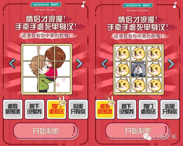 今年双十一,屈臣氏帮助你对单身狗施展暴击,点击【阅读原文】生成你的秀恩爱“狗宫格”,花式虐狗~屈臣氏把虐狗模版都帮大家制作好了,大家只需要上传照片,就能收获强有力的虐狗大片,贴心!