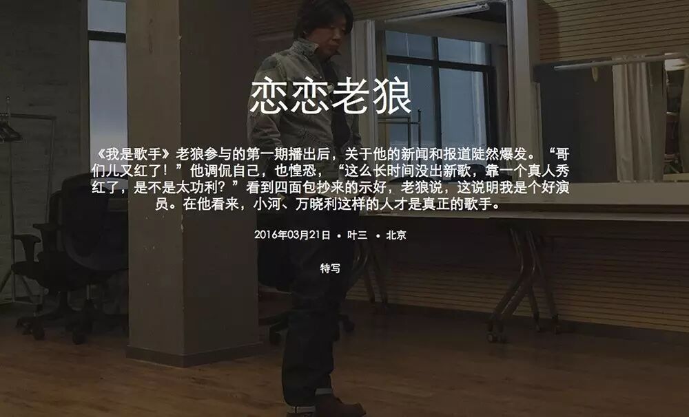 老狼我从来不提他是哥。我们开始见面的时候两个人都照眼,互相绕着圈,谁都不忿谁那种。我最早帮潘劲东伴舞,潘劲东跟老狼是同一拨,全是94新生代,都是一首歌走遍天下。第一印象很糟糕,在我眼里他就是一个走穴的,虽然我也好不到哪去,我是跑歌厅的。我还没认识他的时候,有一次我在汽车里听广播,他做嘉宾聊音乐,“我喜欢Suede,现在放一首《Trash》……”。他比很多摇滚青年都有文化,要排除这些成见跟他坐一块儿聊天才知道他是一个什么样的人。